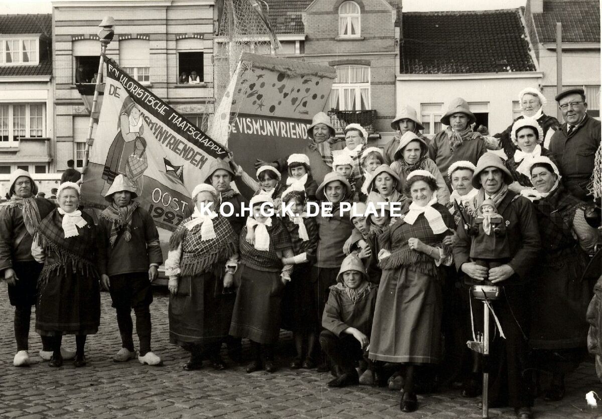 Formaat : 18 x 13.Groepsfoto "De Vismijnvrienden", met hun vlag. " Gesticht op 4 april 1927. Het eerste bestuur bestond uit volgende stichters : Albert Lanoye (voorzitter), Jules Dennekijn (secretaris) en Frans Verbanck (schatbewaarder)." Het eenig doel der maatschappij is het inrichten van feesten en omhalingen ten voordeele der visschers, de huisgezinnen van de slachtoffers der zeerampen en hulp aan behoeftige visschersfamilies te Oostende in werkelijken nood verkeerend.