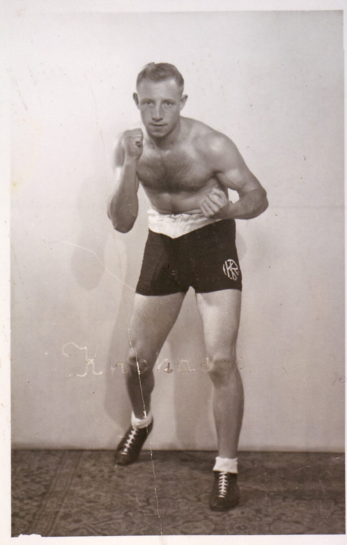 Foto : 9 x 14 cm. - René Knockaert bokste voor de titel van Belgisch kampioen middengewicht op 14/08/1945 tegen Al Baker en verloor door technisch K.O. en op 18/12/1945 tegen Leon Fouquet en verloor door K.O. Zijn carrière als beroepsbokser begon in 1945 en eindigde in 1951. Na zijn carrière als bokser bleef hij actief als trainer en verzorger van de Flandria Boxing Club
