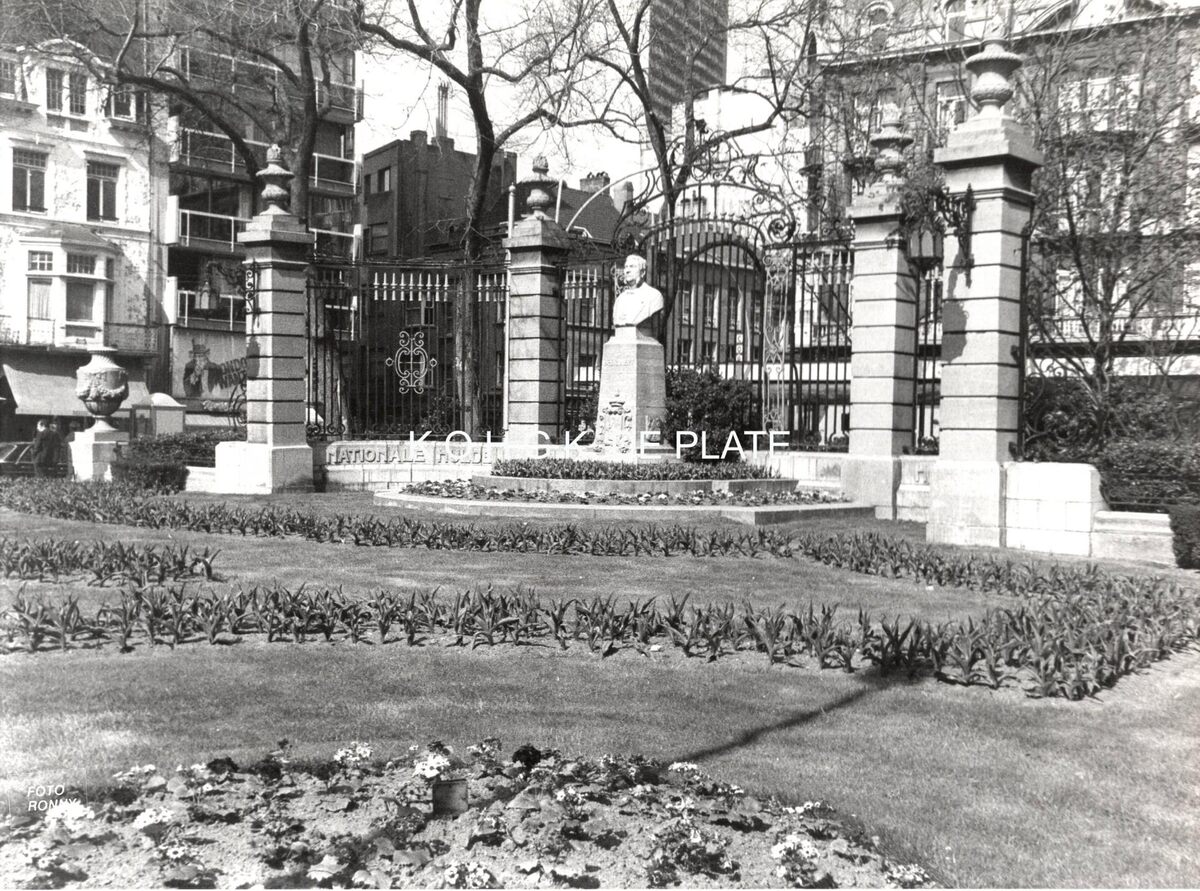 Formaat : 18 x 24 cm. - We zien het Nationaal Huldemonument "Auguste Beernaert". Het beeld van Auguste Beernaert is van Louis Mascré en dateert van 1927. Het smeedijzeren hek is van de Lierse kunstsmid Lodewijk Van Boeckel naar een plan van architect Max Winders. Op de zuilen hangen de enige bewaarde stadsgaslantaarns van Oostende van 1843.