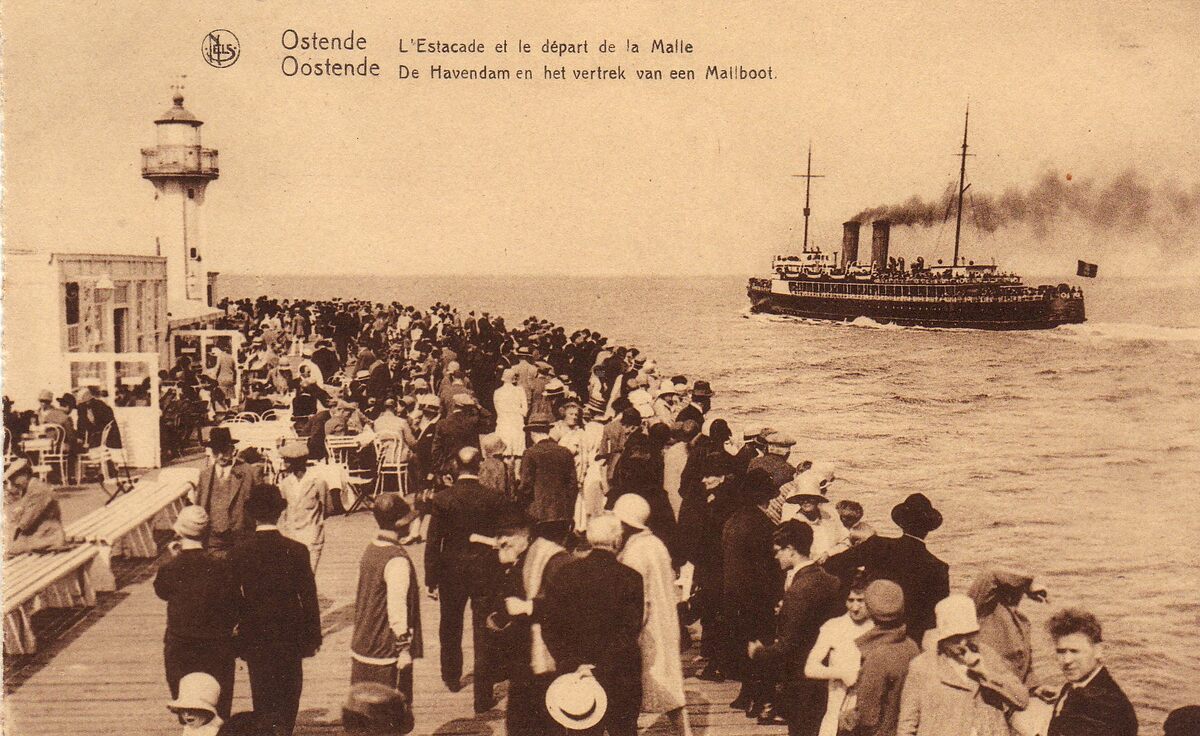 De pakketboot Jan Breydel verlaat de haven van Oostende. Veel volk op het einde van het Weststaketsel. Op 't koptje van 't hoofd"was er ook een paviljoentje waar het heerlijk toeven was en waar je kon genieten van de gezonde zeelucht. Op het einde, het ijzeren torentje met mistbel.
