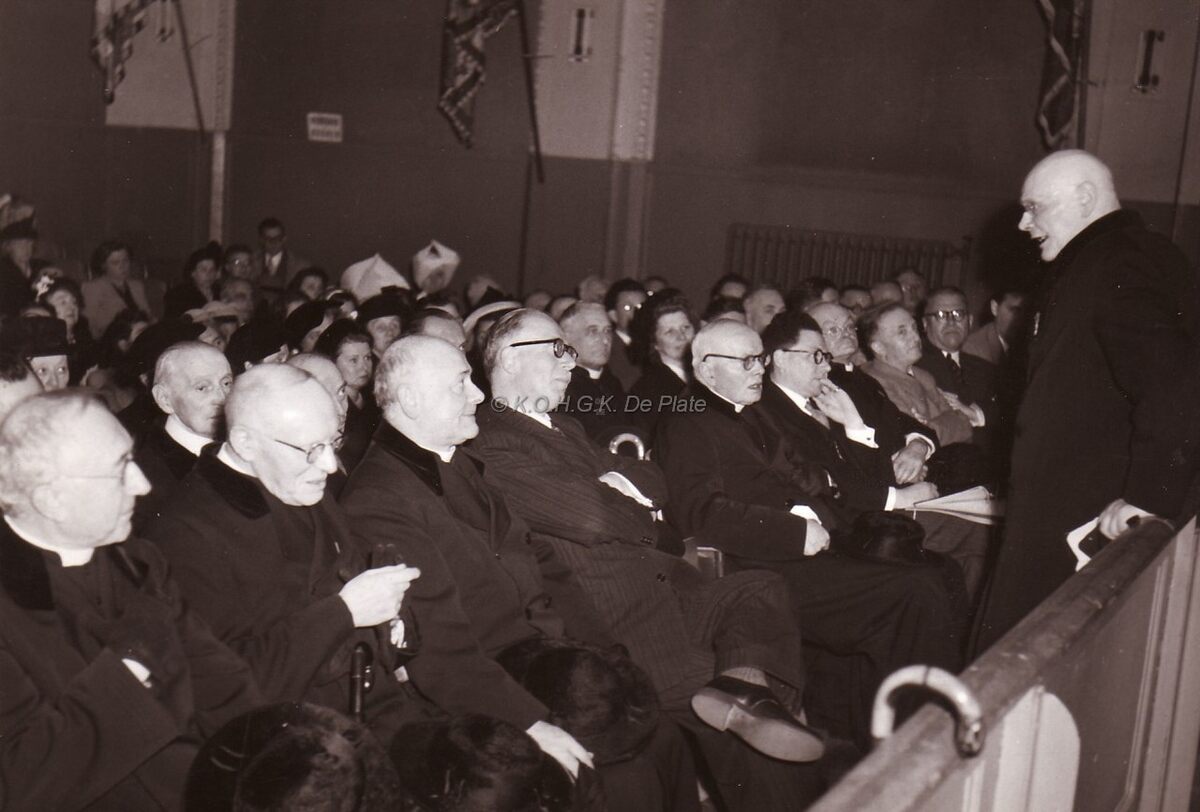 Toespraak door pastoor Afred DEMEESTER in Ciné Nova (Volksbond), centraal toenmalig burgemeester Hendrik SERRUYS.