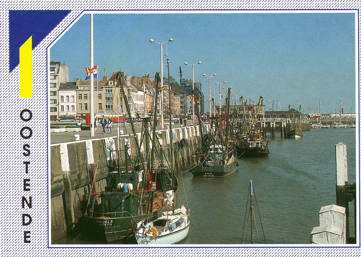 Vissersvaartuigen gemeerd in het Montgomerydok langs de Visserskaai. Vooraan, de O.520 "Manuela" en wat verder de O.100 "Emilie". Wat verder, het Noordzeeaquarium, voorheen de Garnaalmijn en verder een detail van de vistrap.