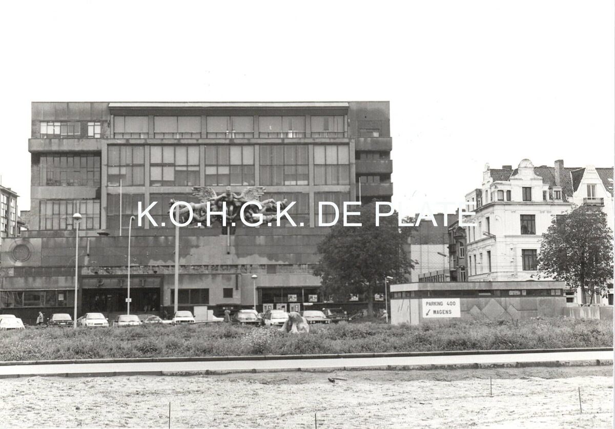 Formaat : 9 x 13 cm; - Postkantoor Hendrik Serruyslaan 18A. Centraal op front van hoofdgevel monumentaal beeldhouwwerk "De Communicatiemedia" of "Eenheid van de wereld door de telefonie, telegrafie en postverkeer" (1953) van Jozef Cantré (Gent) in gedreven rood koper op metaalskelet vervaardigd door de firma Claudoré (Bergen). Compositie waarin centraal naakte gevleugelde godin waarin vier vrouwelijke figuren als representatie van de wereldrassen.