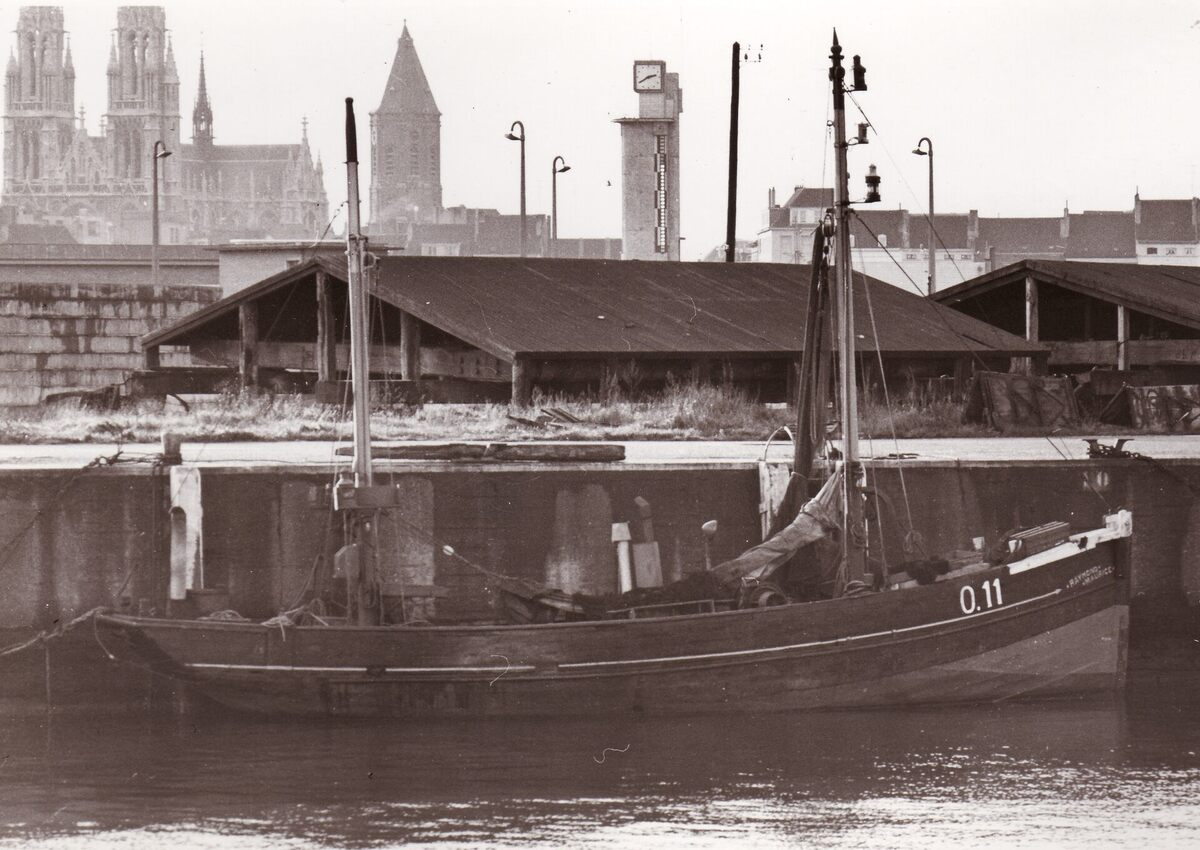 Formaat : 13 x 18 cm. - De O.11 Raymond-Maurice in de havengeul. Dit vissersvaartuig werd als O.1 Fabiola door de Stad Oostende als huwelijksgeschenk gegeven aan Koning Boudewijn en Koningin Fabiola naar aanleiding van hun bezoek op 3 april 1961