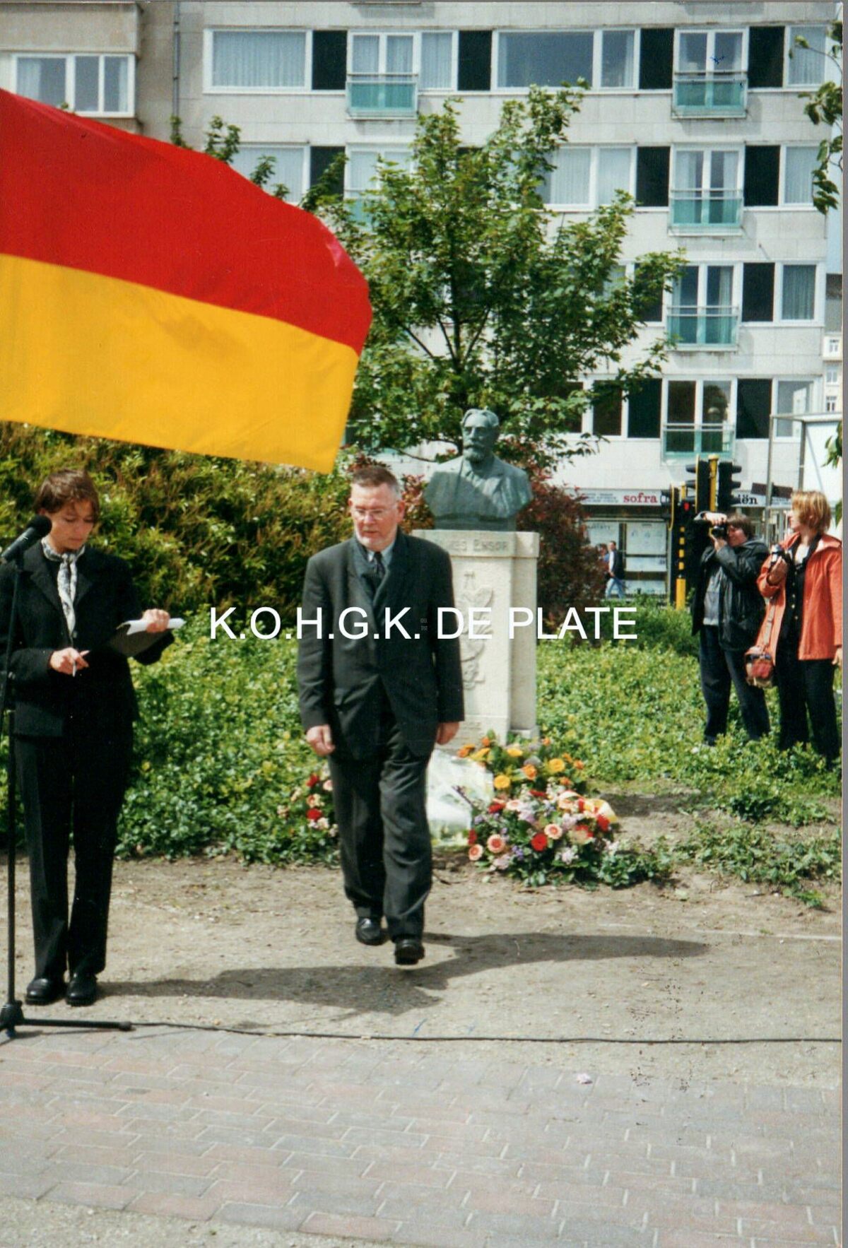 Formaat : 15 x 10 cm.- Omer Vilain legde namens "De Plate" bloemen neer aan het monument van James Ensor in het Leopoldpark.