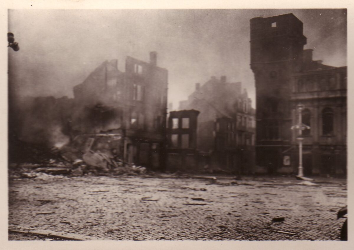Foto : 9 x 6.5 cm. - Ruînes, hoek Wapenplein en Kerkstraat. Op de hoek met de Kerkstraat, de ruïne van de toren van het stadhuis