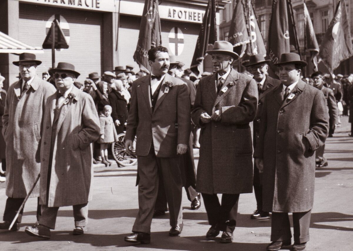 De 1-meistoet aan Petit Paris. Centraal Roger De Kinder, schepen, rechts naast hem, schepen Henri Edebau en burgemeester August Plovie van Bredene.