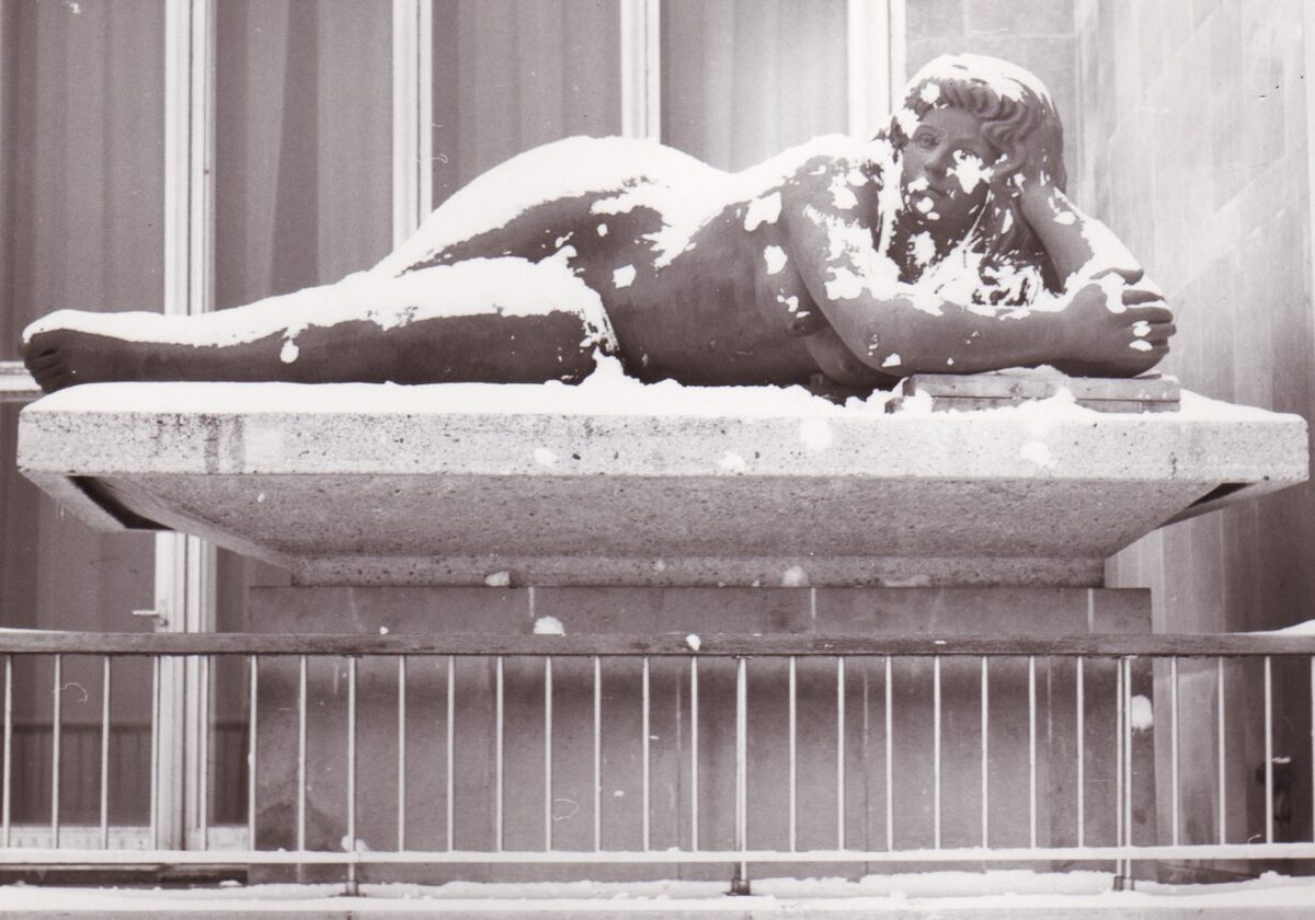 Het beeld "De Zee" alias "Dikke Mathille" onder de sneeuw op haar oorspronkelijke plaats aan het kursaal.