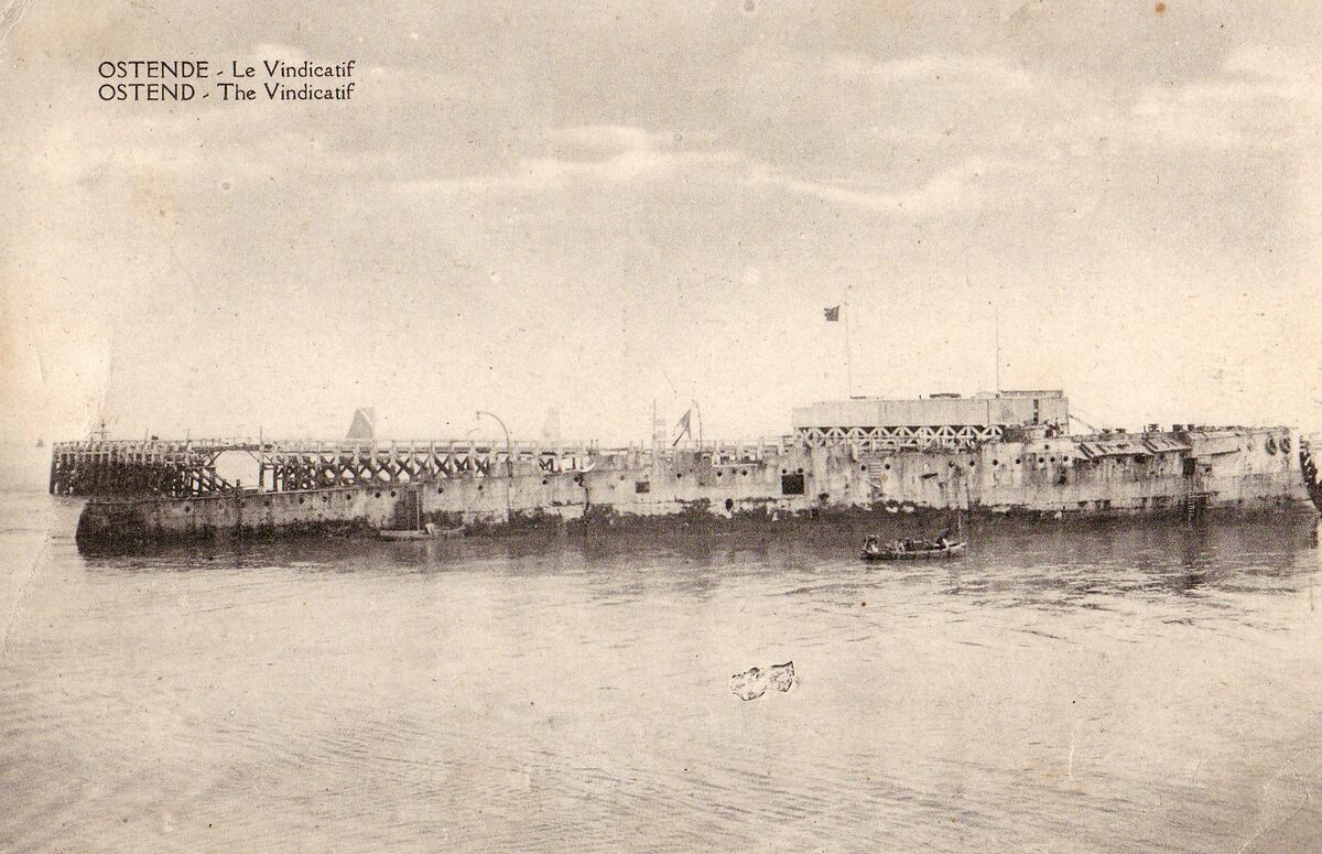 Ostende - Le Vindicatif (sic). Ostend - The Vindicatif (sic). - Het wrak van de HMS Vindictive in de havengeul van Oostende nabij het Ooststaketsel