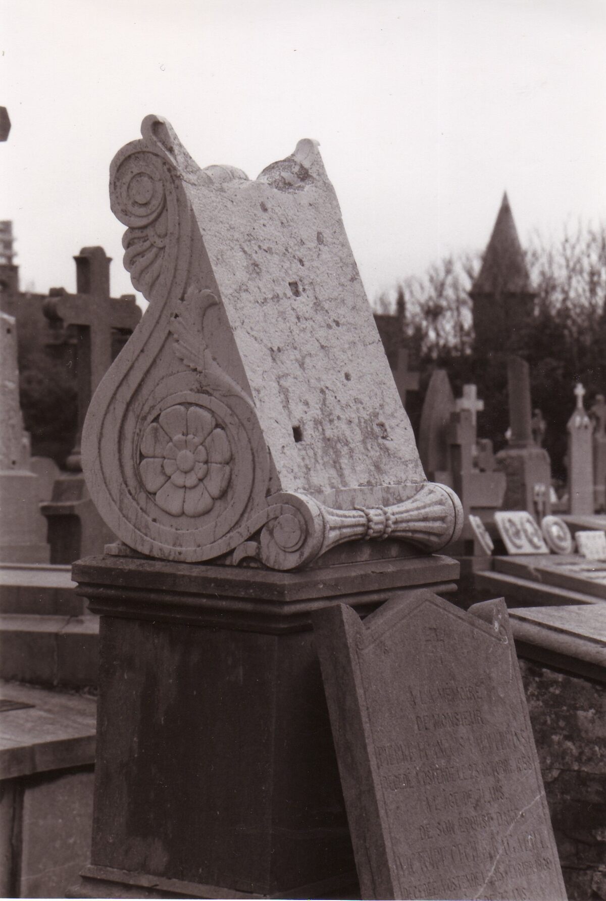 Foto : 9 x 15 cm. - Het graf van Lauwereins Pierre. p.06R - r. 08 - g.06. Een grafsteen met opzij een "volute", een sierelement van de Renaissance