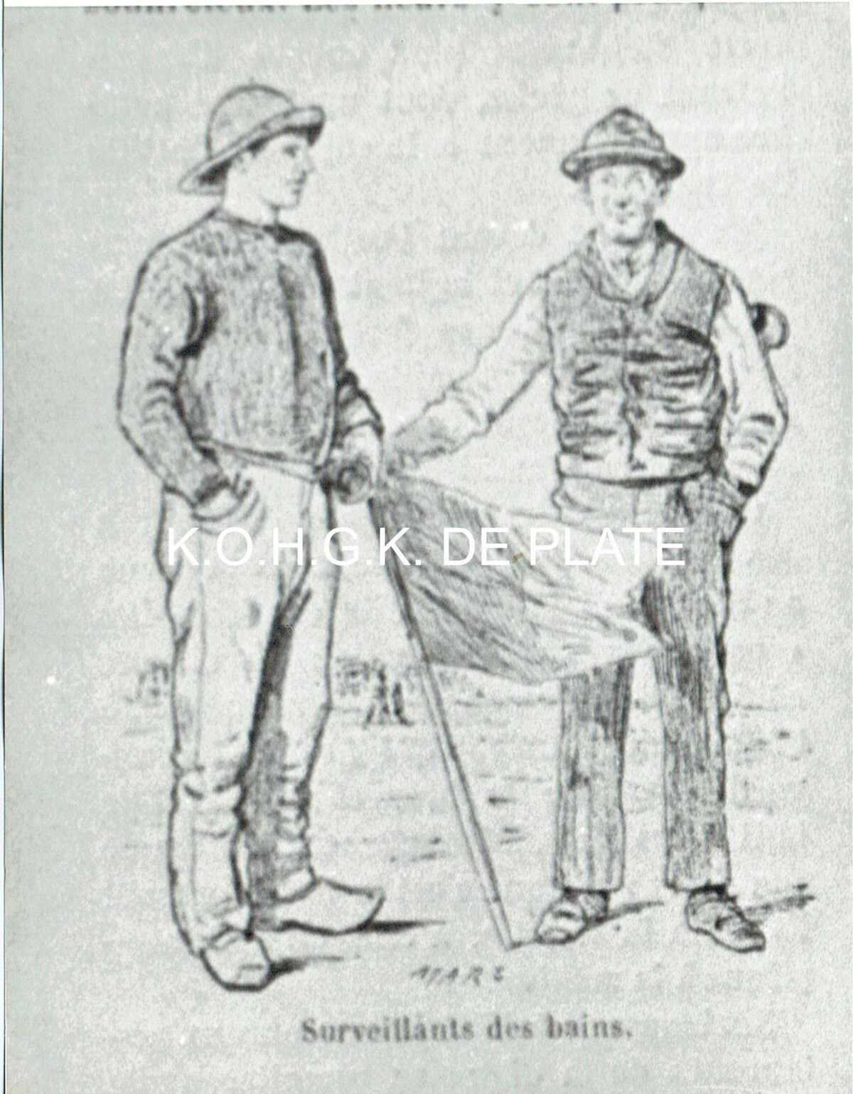 Afdruk van tekening. - Formaat : 16 x 12;5cm. - "Surveillants des bains"