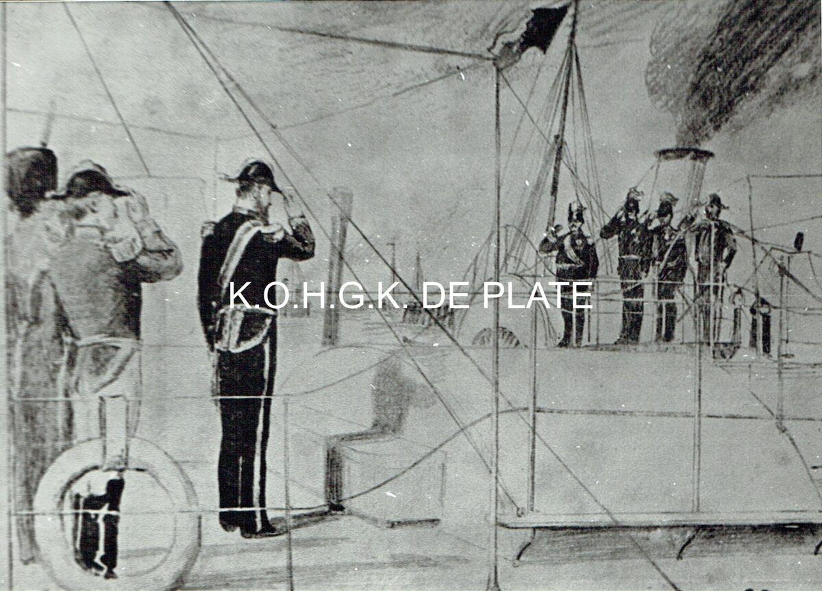 Afdruk. - Formaat : 13 x 18 cm. - De koning gaat aan boord van een raderstoomboot en groet de bemanning.