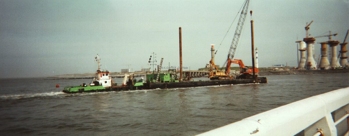 Formaat : 25 x 10 cm. - Rechts, de eerste reeks windmolens in aanbouw op de oosteroever