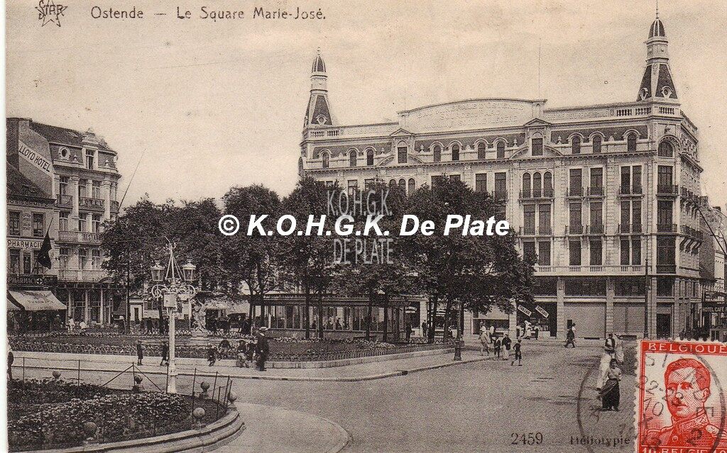 Star, N° 2459. - Ostende - Le Square Marie-José. - Het Marie-Joséplein gezien vanuit de Leopoldlaan. Op de achtergrond, het tramwachthuisje en het gebouw Bouchery. Links, het "Lloyd Hotel", op de hoek met de Madridstraat. Let op de sierlijke straatverlichting in de Leopoldlaan