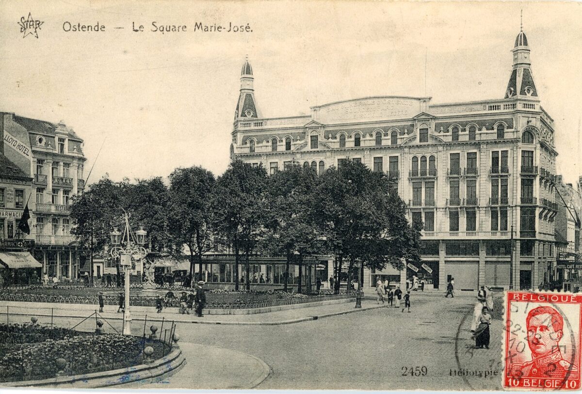 Het Marie-Joséplein gezien vanuit de Leopoldlaan. Op de achtergrond, het tramwachthuisje en het Boucherygebouw. Linksop de hoek met de Madridstraat, het Lloyd Hotel. Let op de sierlijke straatverlichting in de Leopoldlaan