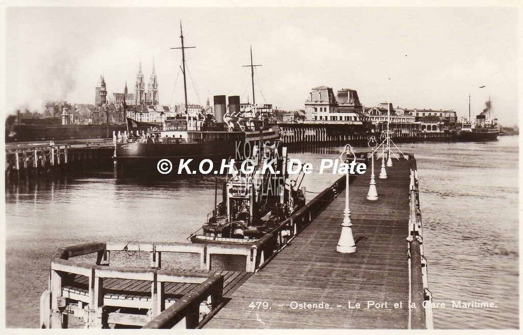 Real photo, N° 479. - Ostende - Le Port et la Gare Maritime. - De pakketboot "Prince Léopold" aan de kaai nabij het Zeestation. Op de voorgrond, een baggermolen van de firma Decloedt