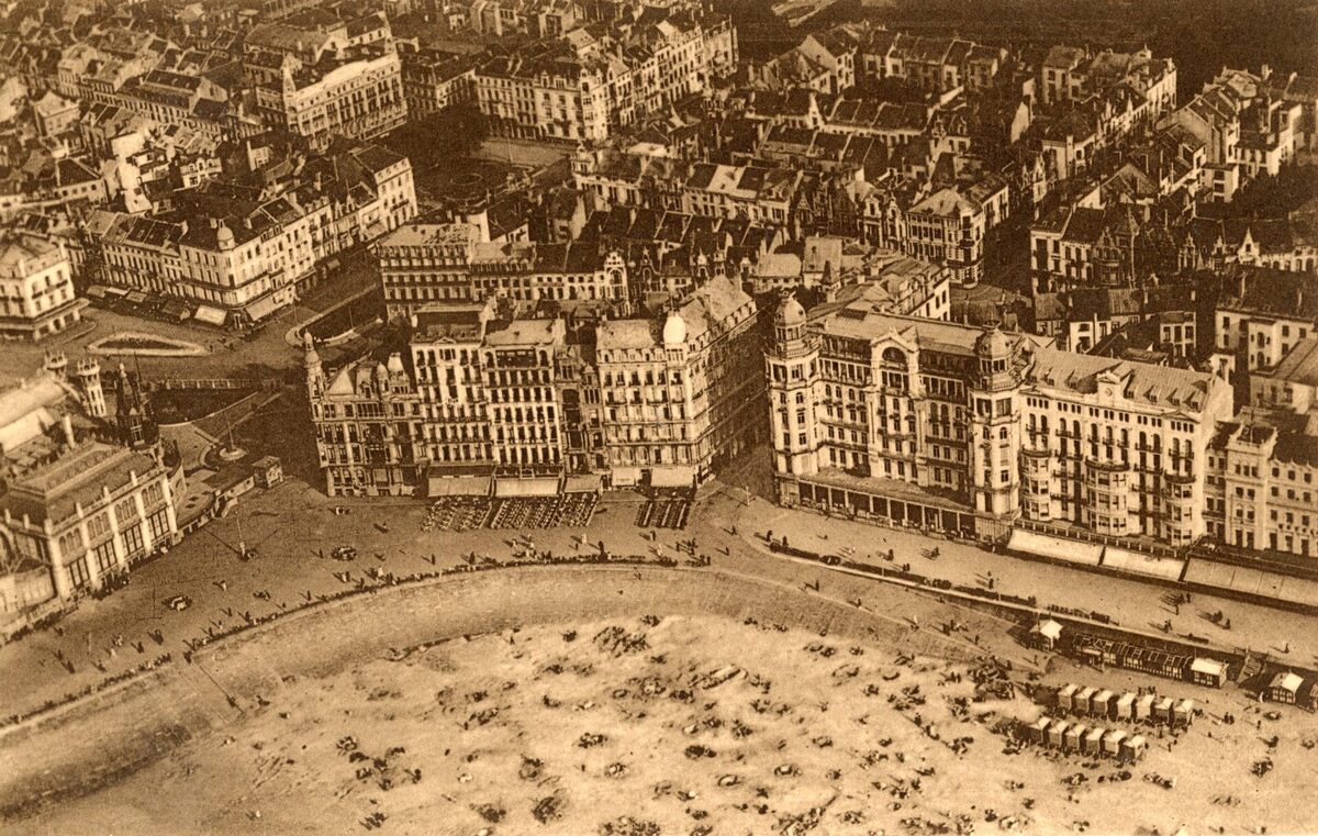 Luchtfoto van de Zeedijk, het Groot Strand en detail van de westgevel van het derde Kursaal. We zien ook een gedeelte van het centrum rond de Leopoldlaan en de Kemmelbergstraat