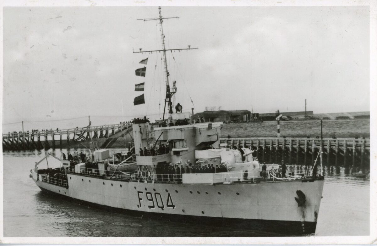 Foto Luc 463. - echte foto. - De F.904 De Brouwer in de havengeul van Oostende. Op de achtergond, de Oosteroever met het militaire domein De Halve Maan. Deed ook dienst als visserijwachtschip (1959-1961)