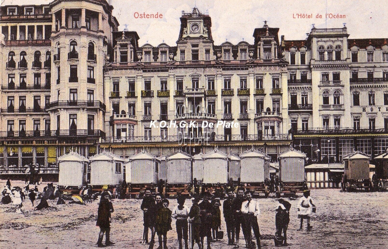 Grandes Galeries Belges. - Ostende - L'Hôtel de l'Ocean. - Bijgekleurde kaart. - Het "Hôtel de L'Océan" gelegen langs de Zeedijk. Vooraan, strandrecreatie met spelende kinderen op het Groot Strand en de traditionele badkarren