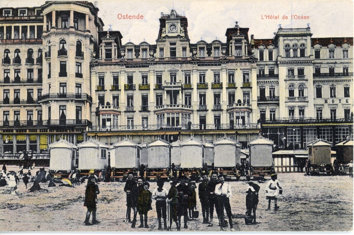 Recht Hotel de L'Océan gelegen langs de Zeedijk. Spelende kinderen op het Groot strand en de traditionele badkarren
