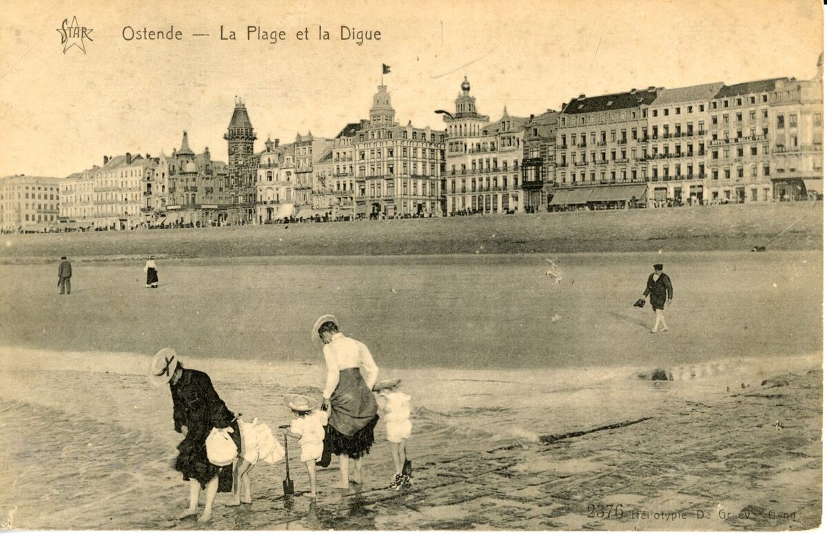 Pootjebaden op het Groot strand. Grote hotels langs de Zeedijk