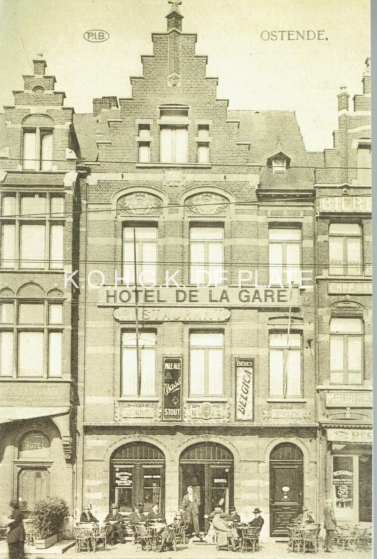 Afdruk. - 29 x 19 cm. - "Hôtel de la Gare" was gelegen op de Vandersweepplaats, nu Ernest Feysplein, op de wijk Hazegras. Het werd reeds in 1902 opengehouden door Jerôme Rommelaere-Staelen (zie gevelopschrift). Reclamepanelen voor : (1) Pale Ale. Bass. Stout en (2) Bières. Belgica