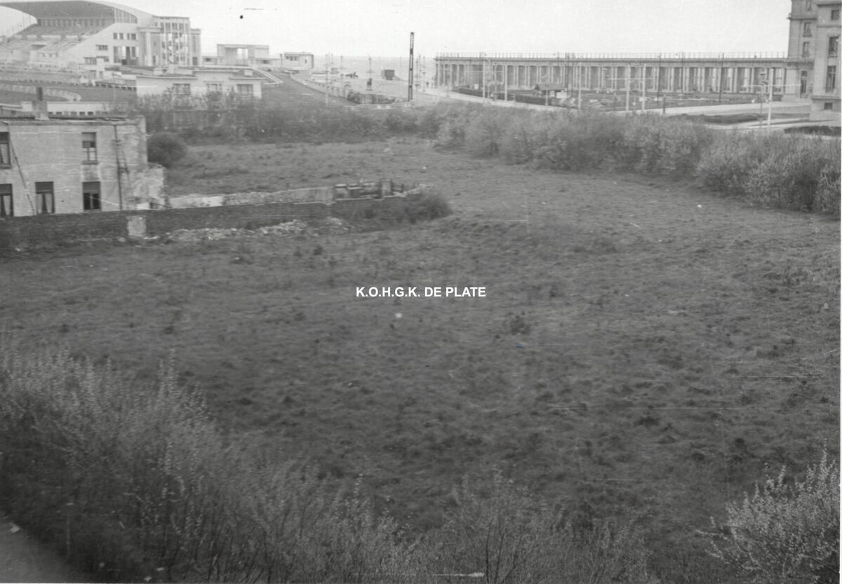 Formaat : 17 x 12 cm. - Achterzijde van de huizen gebouwd in de Sportstraat. Na afbraak deed het terrein dienst als parking voor de Wellingtonrenbaan. Hier staat nu bibliotheek "Kris Lambert". Op de achtergrond links, de tribune van de renbaan. Aan de overkant van de straat staat het Thermae Palace Hotel en de Koninklijke Gaanderijen