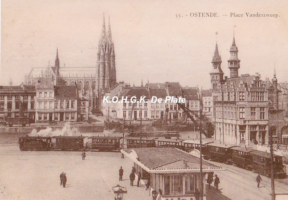 Foto kopie van een postkaart 30 x 20. Ostende. Place Vanderzweep. Vandersweepplaats, nu Ernest Feysplein. Het tramwachthuisje en een stoomtram. Rechts het politiekantoor, gebouwd in neo-Vlaamse renaissance stijl naar de plannen van de Oostendse architect Gustaaf Vandamme, in 1905. Het tweede torentje is van het Zeevaartcommissariaat. Op de achtergrond, het eerste handelsdok, de Keizerskaai, vanaf 1919 Vindictivelaan en de Sint Petrus en Pauluskerk