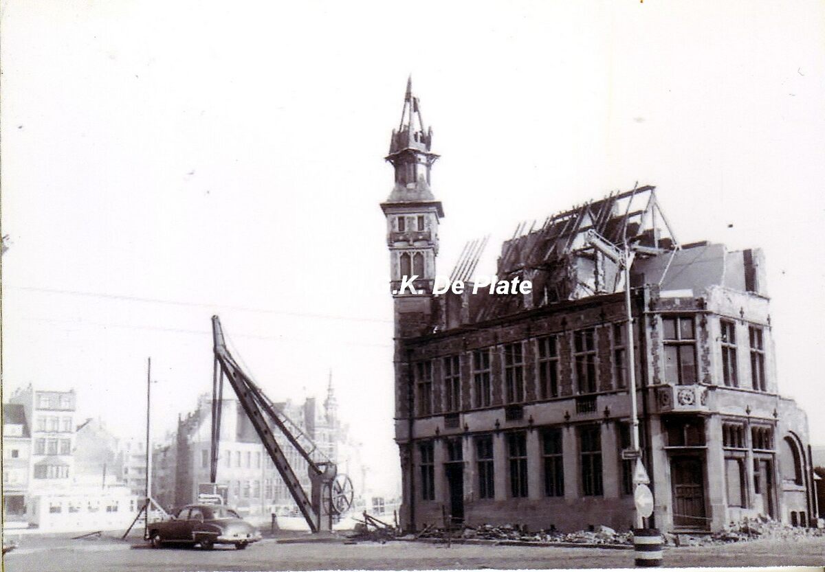 Foto 12.5 x 8.5. De ruïne van het politiekantoor op de wijk Hazegras. Op de achtergrond de Vindictivelaan. De Hazegraswijk leed zware beschadigingen tijdens de Tweede Wereldoorlog, die de wijk na de oorlog van gezicht liet veranderen. Hier het politiekantoor in neo-Vlaamse renaissance, gebouwd in 1905 naar de plannen van de Oostendse architect Gustaaf Vandamme. Het werd uiteindelijk afgebroken voor de aanleg van de Leopold III-laan. Op die plaats, inplanting van de Stedelijke Hotelschool in 1956-1957.