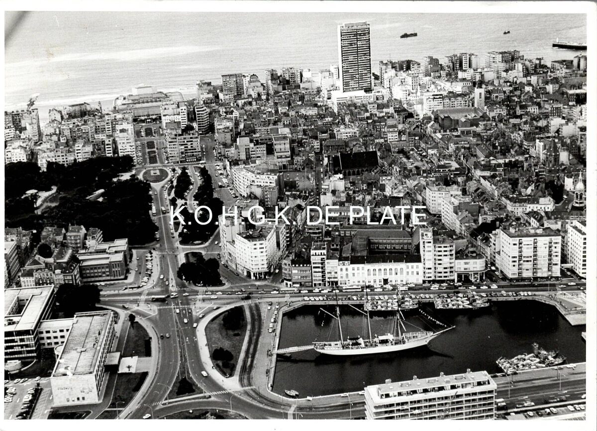 Formaat : 18 x 13 cm. Luchtfoto van het centrum. In de Mercator jachthaven liggen 6 mijnenvegers van de marine gemeerd en het zeilschip-museum "Mercator". Links het stadhuis, wat verder het gerechtshof en het Leopoldpark en de Leopold II-laan tot aan het Kursaal