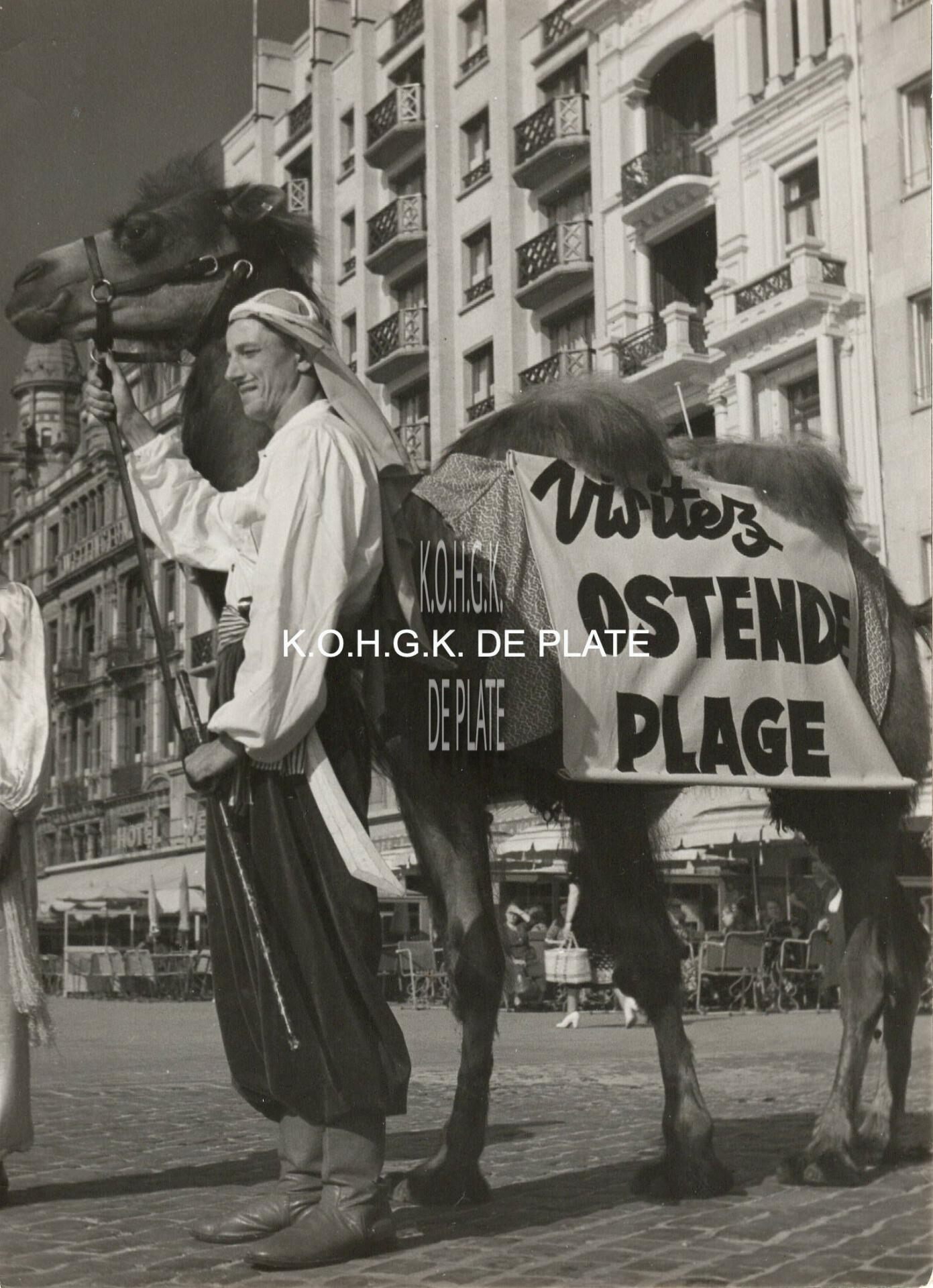 Formaat : 18 x 13 cm. -De volksfiguur en zanger "Bertino" (Albert Lingier 1915-1969), lid van de groep "Ali Baba en de 40 Rovers", op de Albert I-promenade. Hij maakt reclame voor "Ostende Plage", en is op wandel met een kameel en gekleed als een van de 40 rovers.
