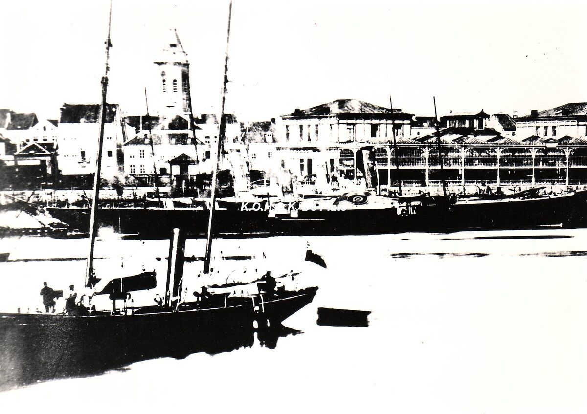 Afdruk, formaat : 17.5 x 12.5 cm. - De raderstoomboot "Prince Baudouin" (1872-1897) gemeerd nabij het eerste Zeestation. Op de achtergrond, de toren van de Sint-Pieterskerk, bijgenaamd "De Peperbusse".