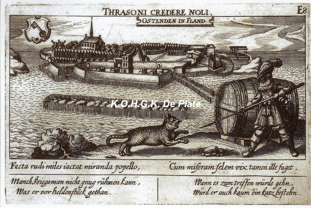 Tropic T 440. - Ostenden in Flandren. Afdruk van een kopergravure. Allegorische voorstelling over het beleg van Oostende. We zien de stad vanuit het noorden met rechts de oude haven en links de pas gevormde "Geule" . Op de voorgrond een gewapende krijgsheer die met een spies een klauwende ket (leeuw) onder bedwang houdt.