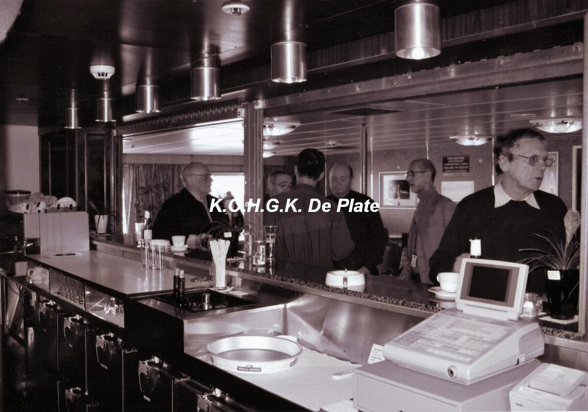 Afdruk, formaat : : 29.5 x 21 cm. - Enkele ex-werknemers van de R.M.T. brengen een bezoek aan de carferry "Primrose". Uiterst rechts, August Goethaels. Vierde van links, chief-steward, Luc Geijs