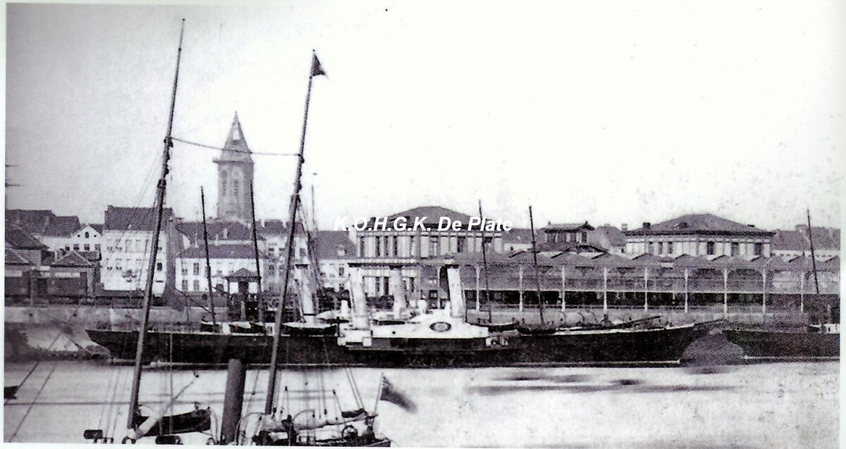 Afdruk, formaat : 15 x 9 cm. - De raderstoorboot "Prince Baudouin" (1872-1892) gemeerd nabij het eerste Zeestation. Op de achtergrond, de toren van de Sint-Pieterskerk bijgenaamd "De Peperbusse".