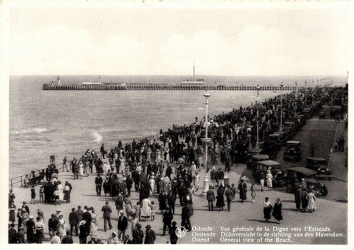 Formaat : 10 x 15 cm. - Nels "Bromurite". - Ostende - Vue générale de la Digue vers l'Estacade. Oostende - Dijkoverzicht in de richting van den Havendam. Ostende - General view of the Beach. - De Zeedijk vanaf Kursaal-Oosthelling richting havengeul. Met zicht op de staketsels en tijseinpost.