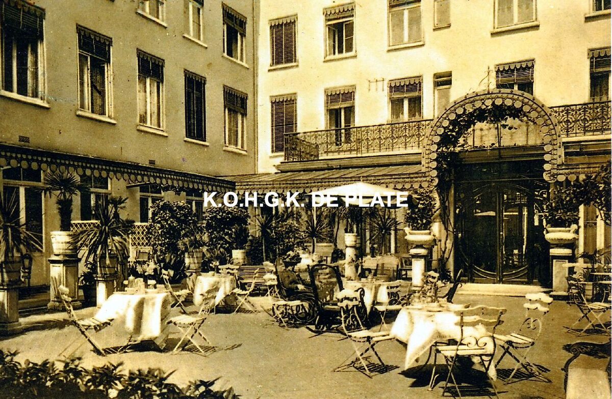 Afdruk. - Formaat : 12,5 x 19 cm. - Binnenzicht van de binnenkoer van Grand Hotel Fontaine