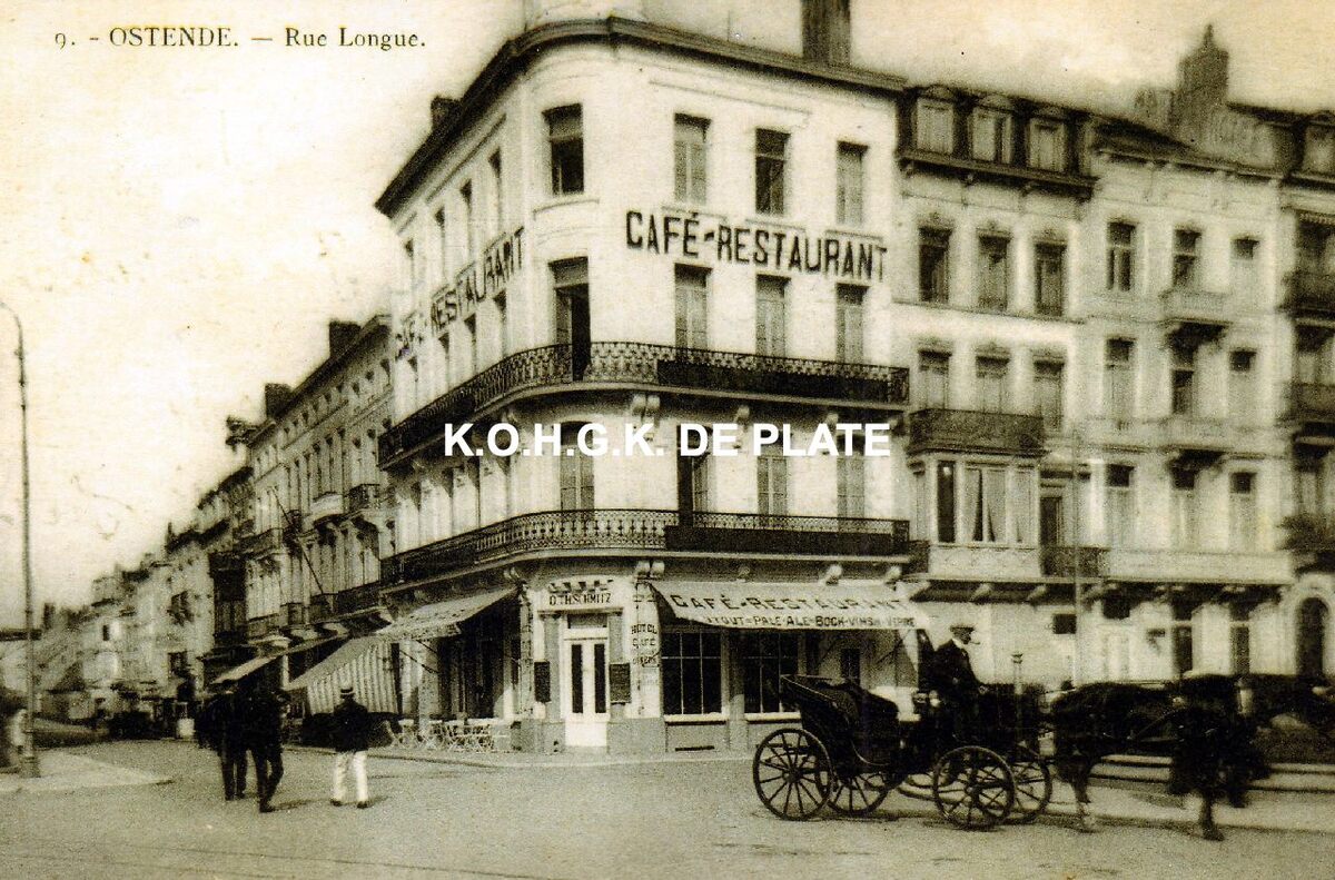 Afdruk postkaart. - Formaat : 12,5 x 19 cm. - Langestraat nr. 2 : Hotel Vienna met café restaurant uitgebaat door O. Th. Schmitz op de hoek van de Langestraat en Leopoldlaan. Op het einde van de Leopoldlaan staat een wachtende paardenkoets.