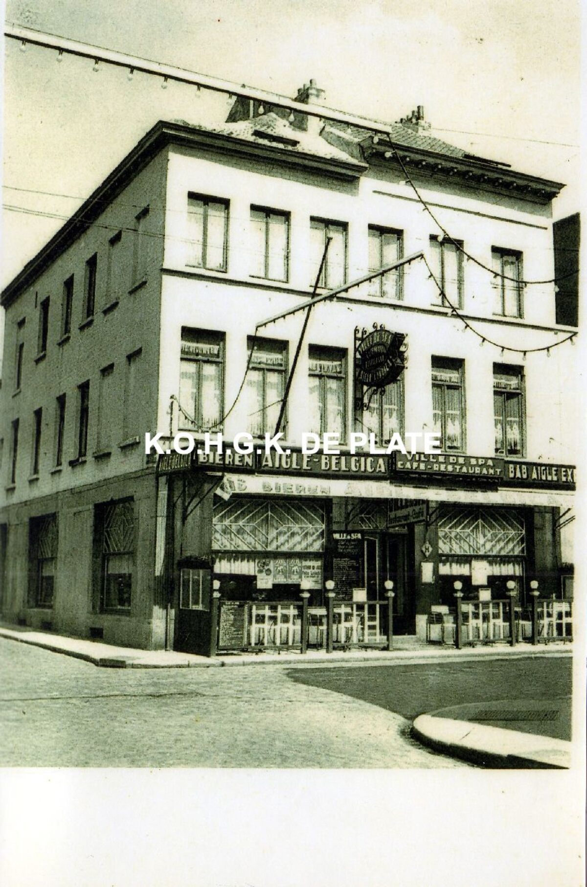 Afdruk. - Formaat : 19 x 12.5 cm. - Langestraat 16 : Café-Restaurant "Ville de Spa", hoek Antoon Belpaire- en Langestraat. Gesloopt voor het woon- en handelsgebouw "Nieuw Helmond"