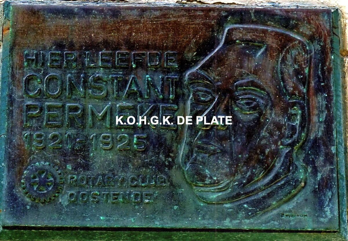 Formaat : 12,5 x 19 cm. - Langestraat 116 : Gedenkplaat aan het voormalig woonhuis van Constant Permeke. De gedenkplaat is een ontwerp van Willy Bosschem op initiatief van Rotary Club Oostende en werd onthuld op 9 juni 1984.