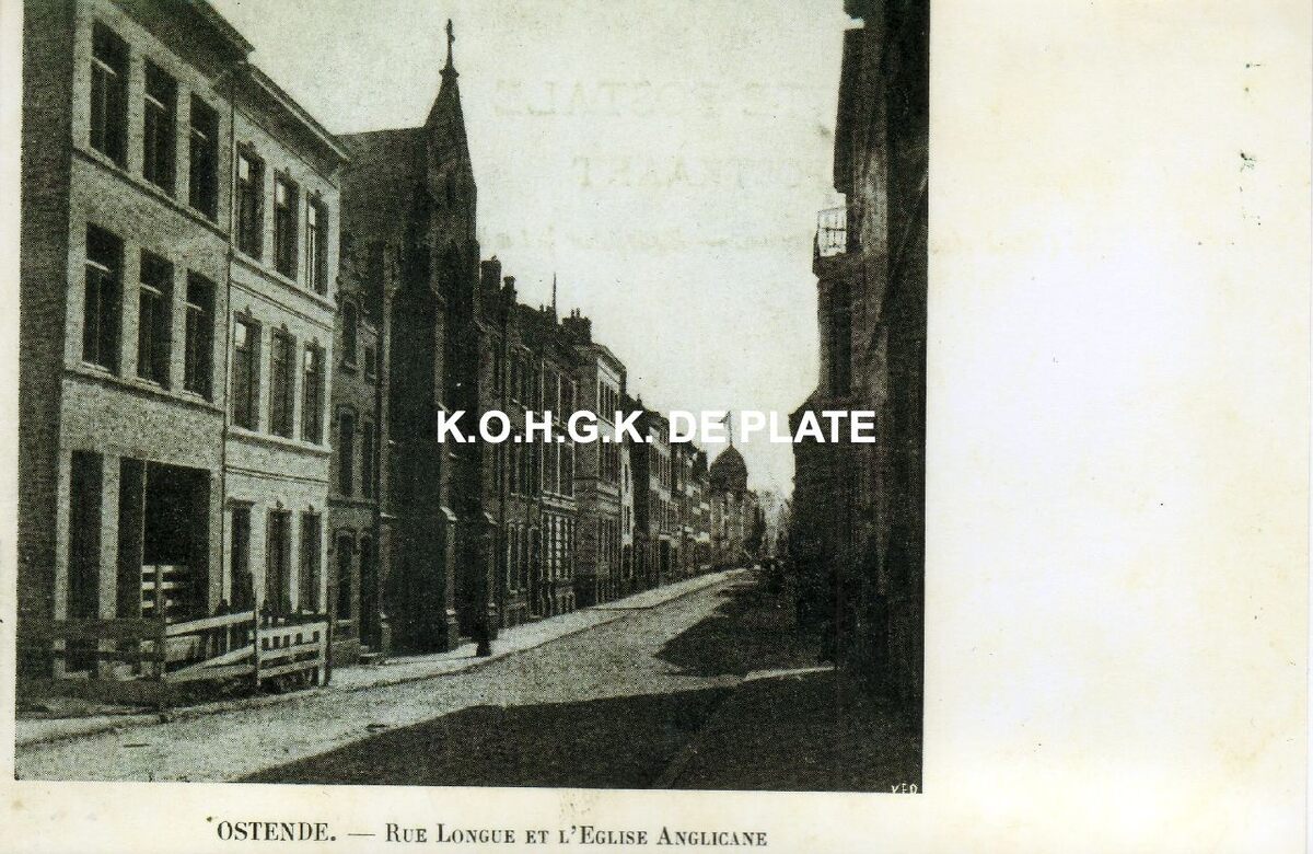 Afdruk. - Formaat : 12,5 x 19 cm. Straatbeeld Langestraat richting Kursaal : in het midden de Anglicaanse Kerk op nr. 101.