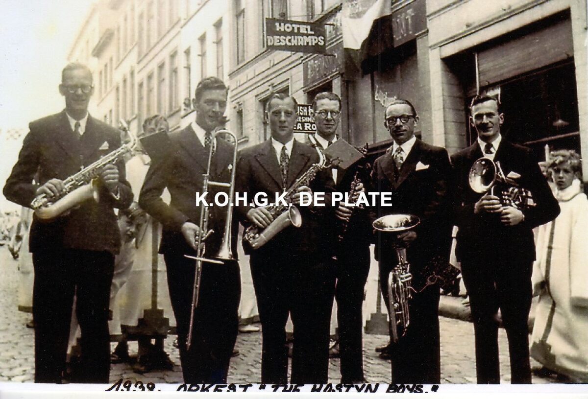 Afdruk. - Formaat : 12,5 X 19 cm. - Orkest "The Hostyn Boys" in 1939 vòòr het "Hotel Descamps", Langestraat 109.