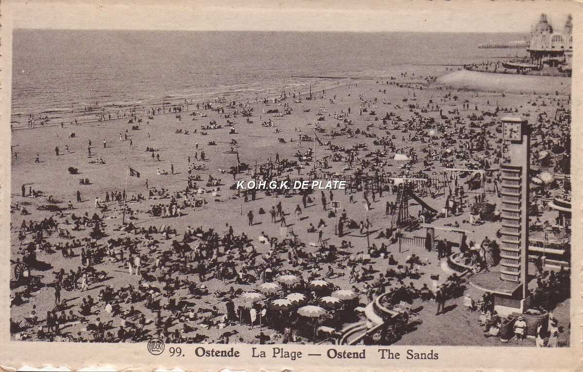 Albert, N° 99. - Ostende - La plage. Ostend -The sands. - Strandrecreatie op het Groot Strand nabij de badinstallaties onder de Albert I-promenade. De lichtkolom en openbaar uurwerk van de badinstallaties. Op de achtergrond, detail van de westgevel van het derde Kursaal