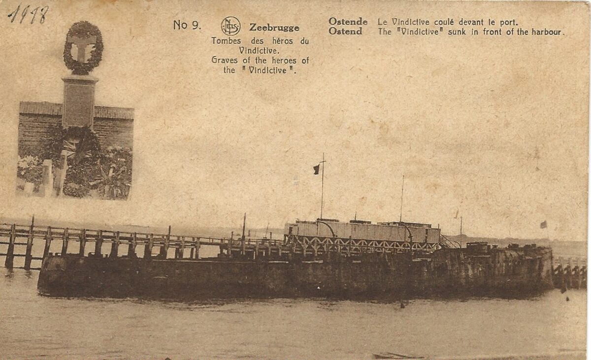 Nels, N°9. Edition J. Revyn, 14, rue du Canada, Bruxelles. - Zeebrugge - Tombes des héros du Vindictive. Graves of the heroes of the "Vindictive". Ostende - Le Vindictive coulé davant le port. Ostend - The "Vindictive" sunk in front of the harbour. - Het wrak van de HMS Vindicitve in de havengeul van Oostende, nabij het ooststaketsel. Inzet : Begraafplaats te Zeebrugge van de gesneuvelden van de raid op Oostende. - Map 086-1