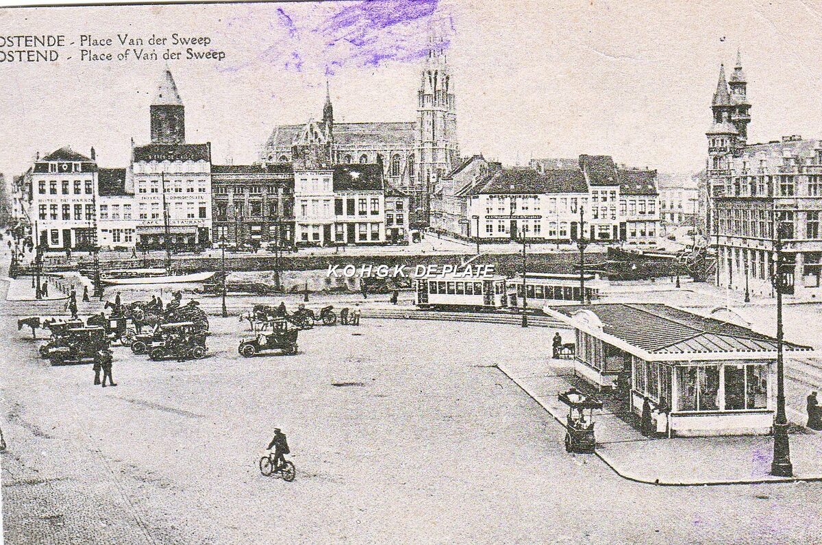Ostende - Place Van der Sweep. Ostend - Place of Van der Sweep. - De Vandersweeplplaats op de wijk Hazegras. Het tramwachthuisje voor de kust- en stadstram. Een ijscokar en een eenzame fietser. Taxi's en koetsiers wachten op reizigers, want links was het tweede spoorwegstation (Oostende-Stad) gelegen. Op de achtergrond enkele grote hotels langs de Keizerskaai. Na de Eerste Wereldoorlog herdoopt in Vindicitivelaan. We zien ook de torens van de Sint-Petrus en Pauluskerk en er naast de toren, genaamd "de Peperbusse" van de door brand vernielde Sint-Pieterskerk.