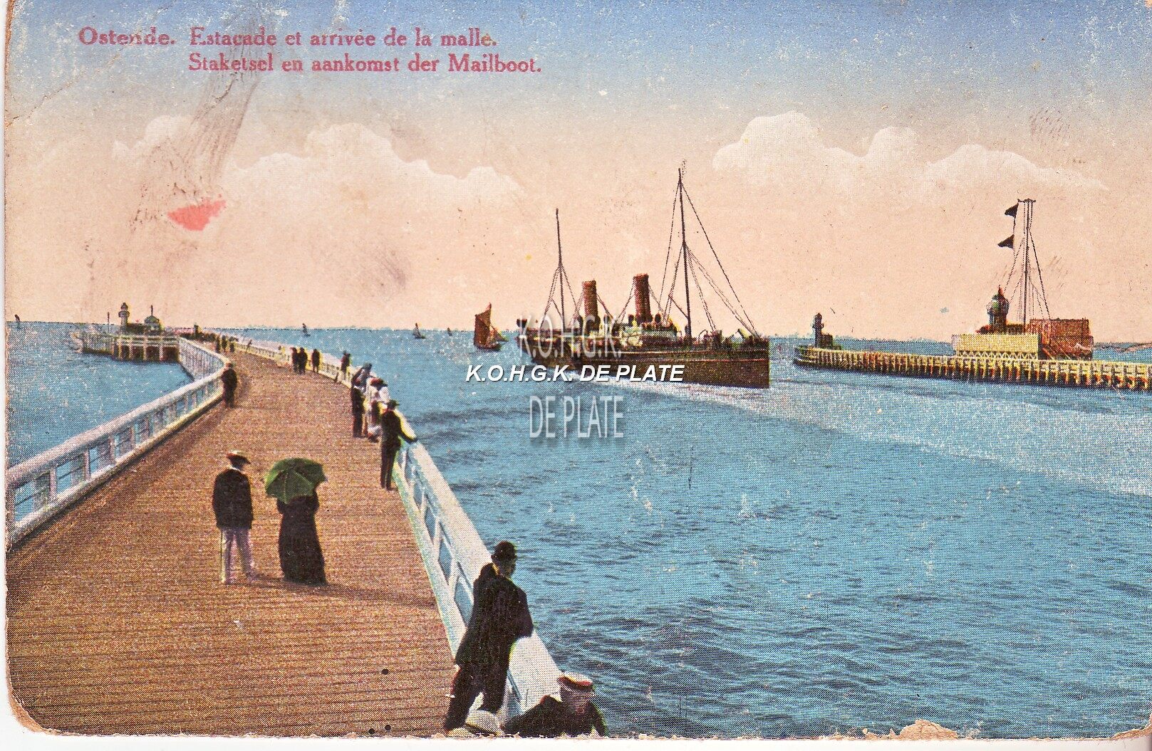 Ostende - Estacade et arrivée de la malle. Staketsel en aankomst der Mailboot. - Gekleurde kaart. - Links, het Weststaketsel en rechts, het Ooststaketsel met tijseinpost. Een pakketboot van de Oostende - Doverlijn vaart de haven uit.