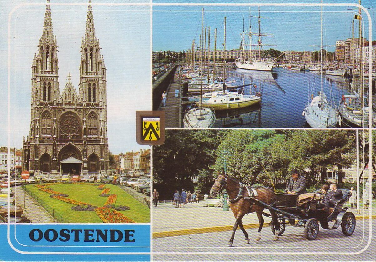 AVM, N° A.204. - Het Sint Petrus en Paulusplein en de Sint Petrus- en Pauluskerk. Zeil- en schoolschip "Mercator" als museum in het tweede handelsdok. De koetsier met paard en koets, een vertrouwd beeld in onze stad tijdens de vakantie