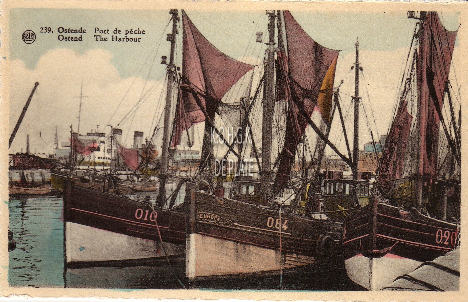 Nels, N° 239. - Ostende - Port de pêche. Ostend - The Harbour. - Gekleurde prentkaart. - De O.208 "Fémina", de O.84 "Europa" en de O.10 "José-Adrienne-Rachel" gemeerd in het Schuildok of het Montgomerydok naargelang de tijdsperiode.