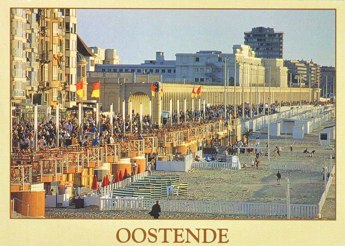 Postkaart AVM A.13. - De Albert I-promenade met het Groot Strand en de Lido. Vooraan links, de Nieuwe Gaanderijen met detail van de Koninklijke Villa en verder, het Thermae Palace Hotel met de Koninklijke Gaanderijen