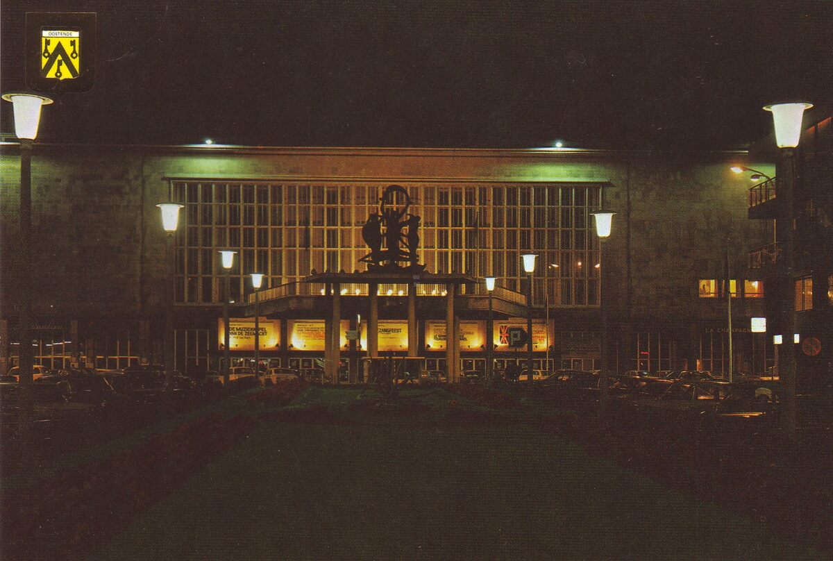 J.V.D.B., N° 102/36. - Nachtfoto van de zuidgevel van het vierde Kursaal gezien vanaf de Leopold II-laan.
